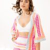 A multi-color crochet bralette with a back tie knot, paired with a straight skirt featuring side slits. Both the skirt and top are fully lined, and the bralette is softly padded.